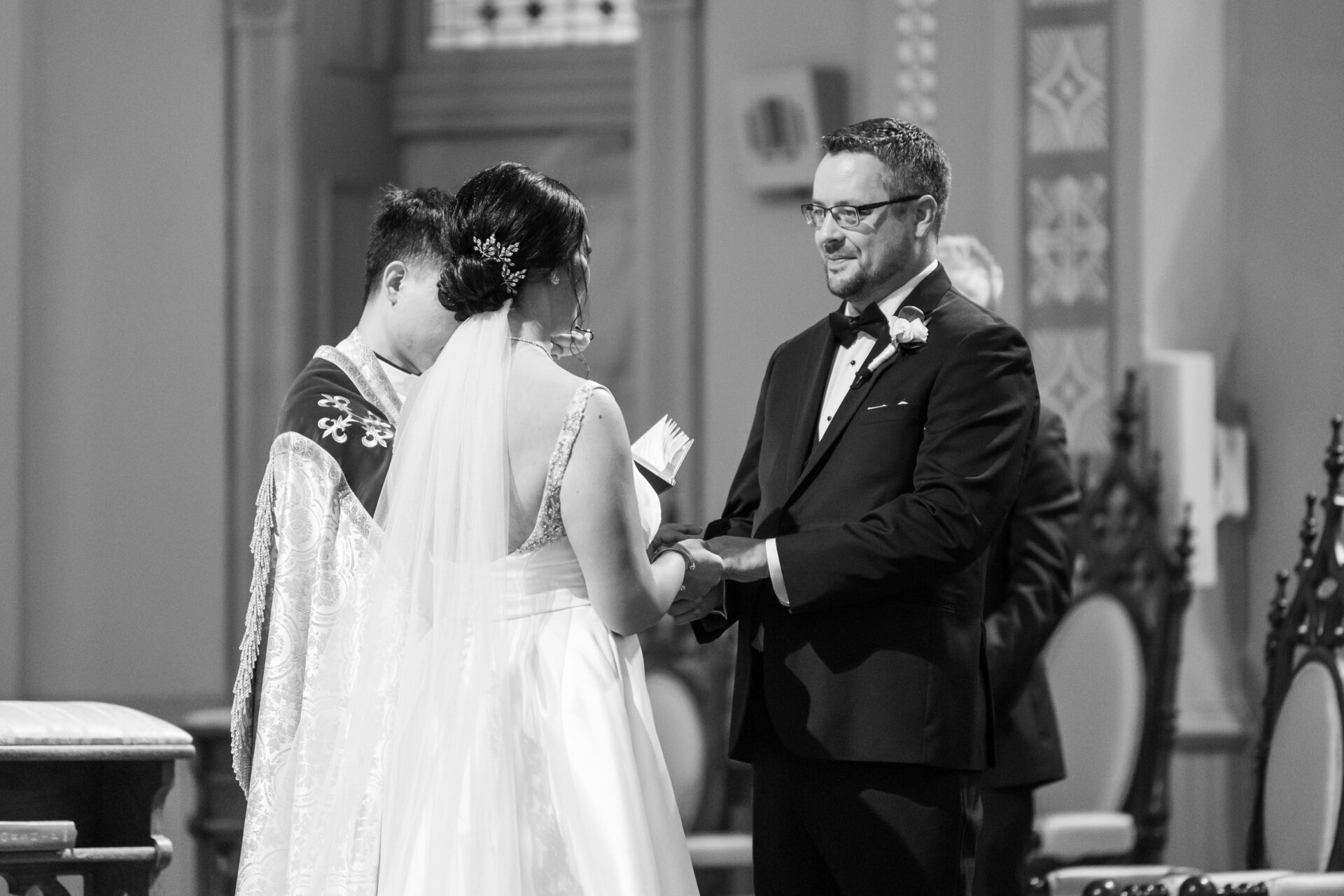 We met the wedding party in Midtown next, where the city had its usual weekend pulse. We made time for clean, classic portraits and photographed a family vintage car that added a meaningful, timeless layer to the story. From there, everyone traveled to St. Mary’s for the ceremony, a space that held a calm anticipation as guests filled the pews.