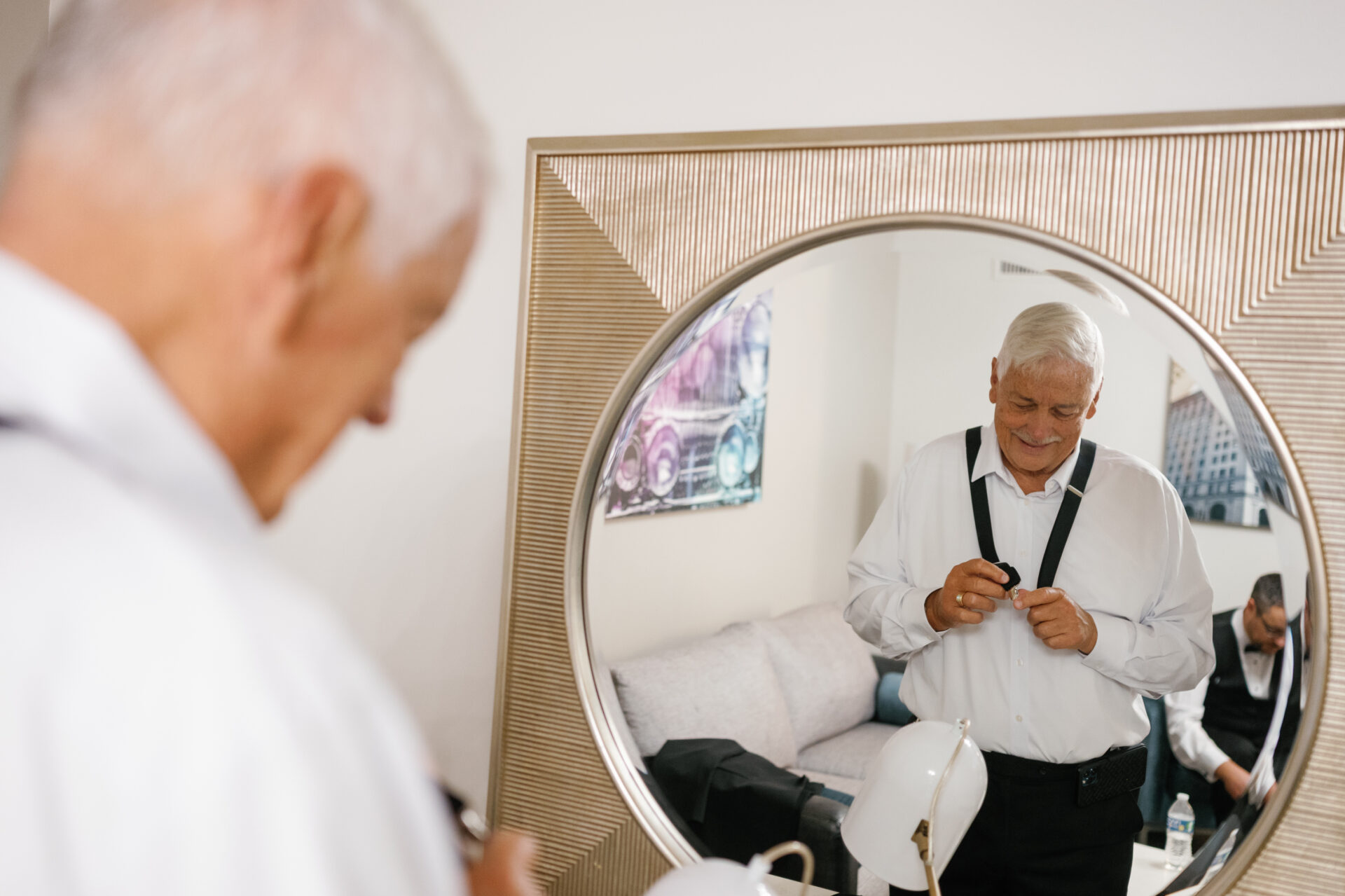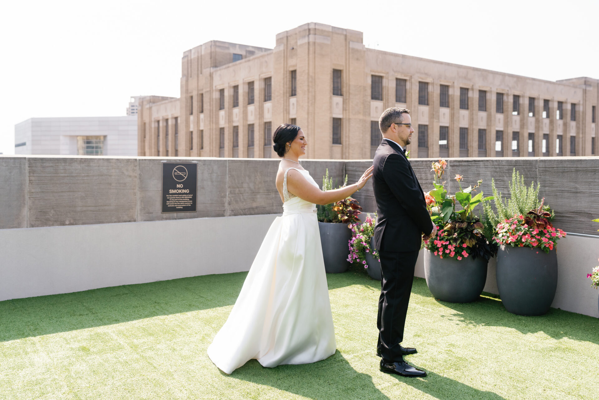 Carolyn and Matt’s Colony Club fusion wedding blended tradition, style, and a kind of steady excitement that stayed with them all day. They got ready at the DoubleTree Suites, each surrounded by their closest people. When it was time, they met on the rooftop of the Cambria Hotel for a first look overlooking Detroit-a quiet, grounding moment before everything picked up speed.