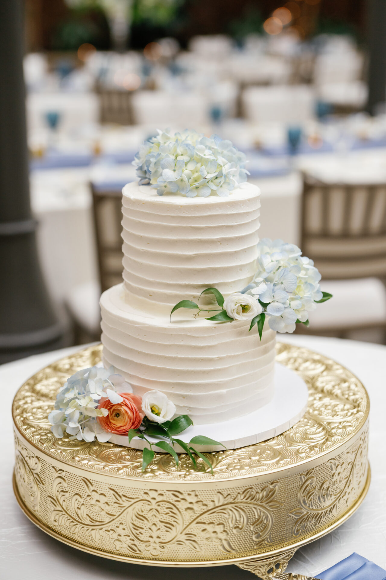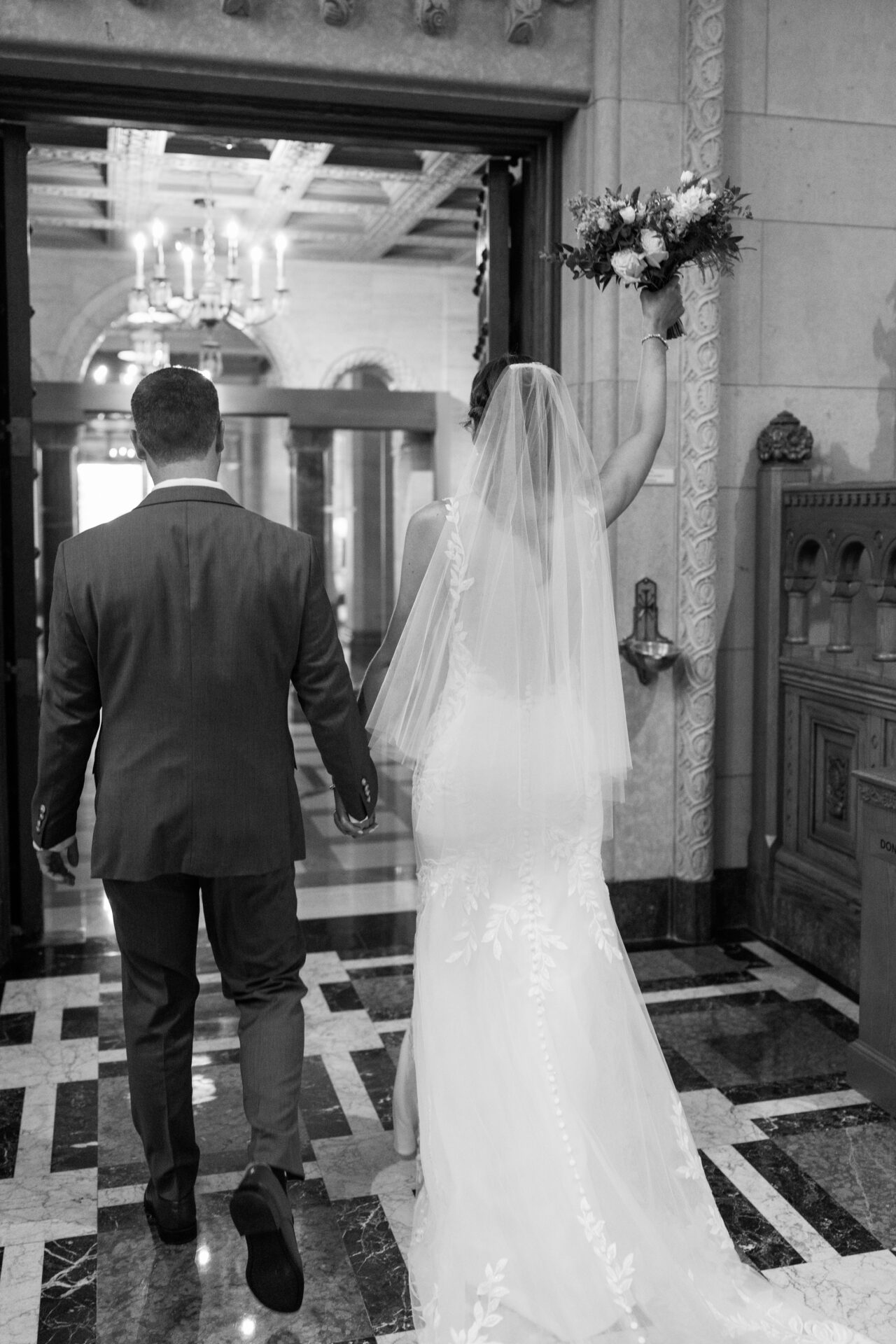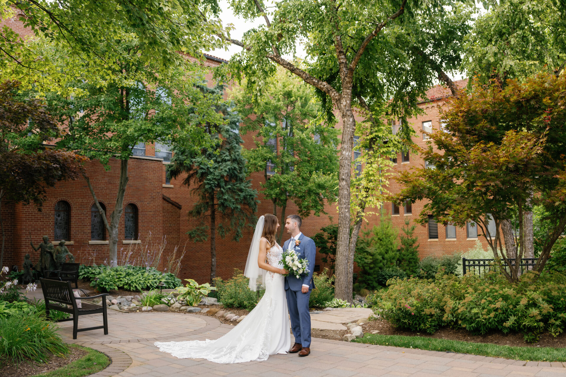 Before the ceremony, Lauren and Mike shared an intimate first look on the resort grounds. The early fall light was soft and warm, and the colors Lauren chose—shades of blue mixed with coral and orange florals—popped perfectly against the timeless architecture of Saint John’s Resort. In a quiet, tucked-away moment, they exchanged private vows before heading into the chapel for their ceremony at St. Francis of Assisi Parish. It was heartfelt, emotional, and filled with the kind of joy that stays with you.